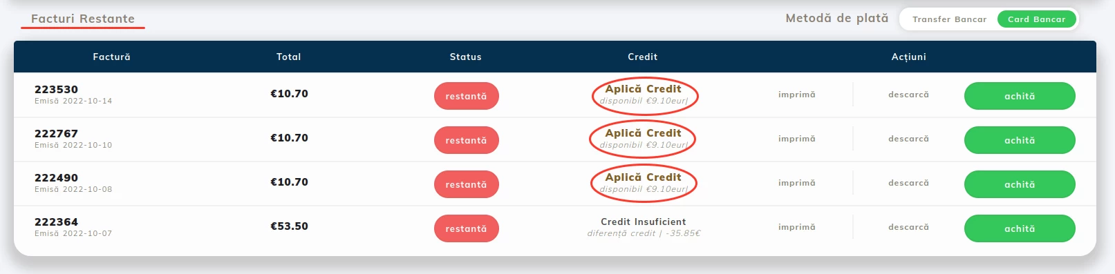 Dėl pasibaigusių sąskaitų bus rodomas pasirinkimas Taikyti kreditą;.