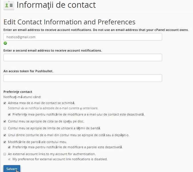 Sužinok, kaip įjungti pranešimus savo cPanel paskyrai ir pakeisti kontaktinę informaciją, kad išvengtumėte saugumo problemų ir vietos trūkumo.