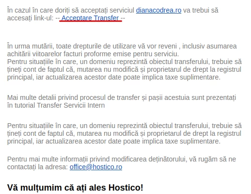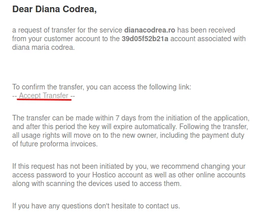 Naudotojas gaus el. laišką į Hostico kliento paskyros el. paštą, kuriame bus prašoma Priimti perdavimą.