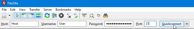 Filezilla prisijungimo laukuose įvesime duomenis taip: