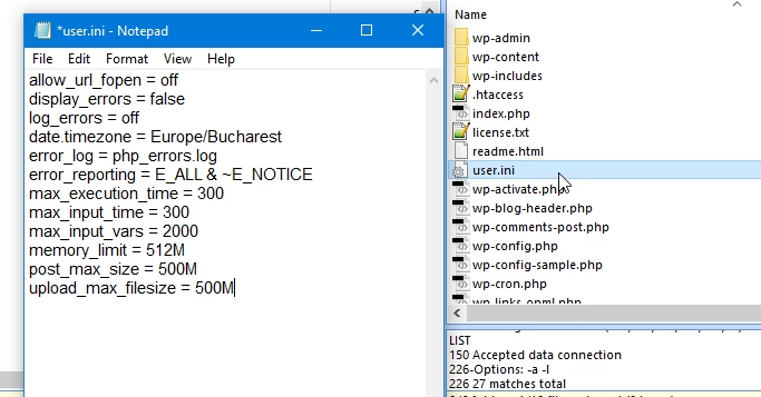 Toliau, norint pakeisti PHP direktyvas, sukursime failą pavadinimu ".user.ini" (vietiniame kompiuteryje), kuriame nustatysime norimas direktyvas. Išsaugojus failą, jį įkelsime į aukščiau pateiktą katalogą, naudojant FTP klientą;