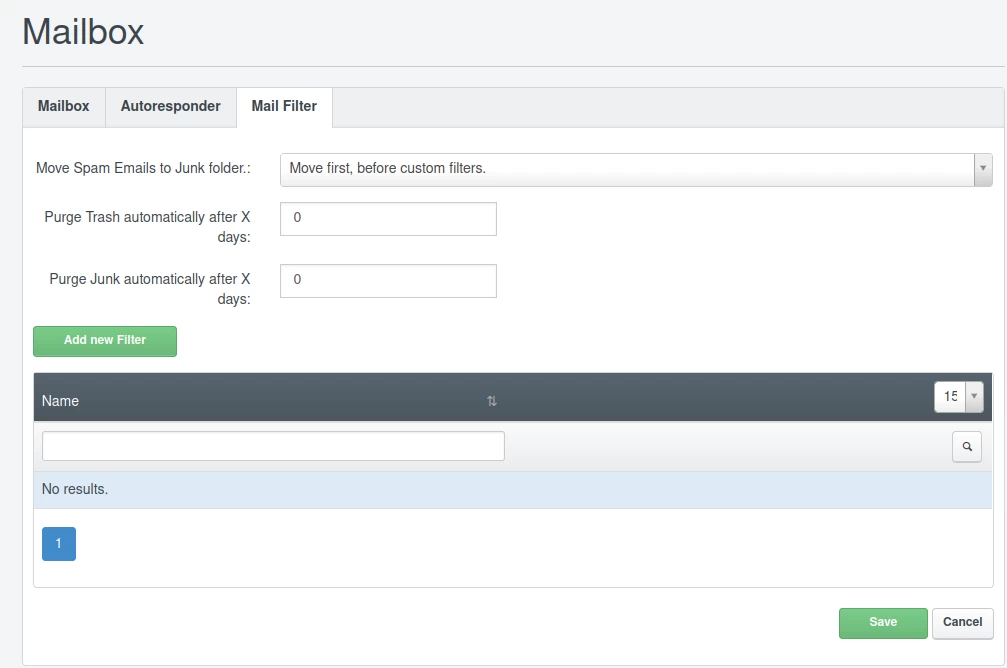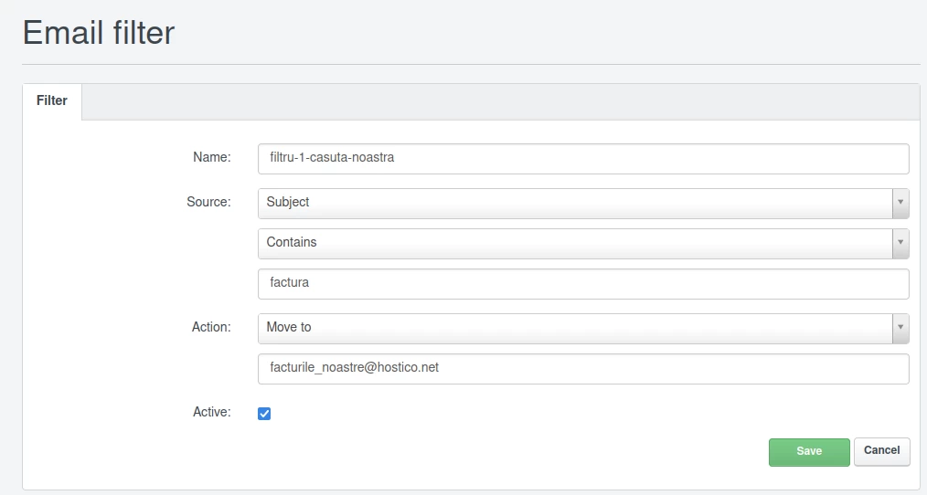 Skiltyje Pašto filtras galime nustatyti pritaikomus papildomus filtrus el. laiškams, siunčiamiems į paštą, kurie bus vykdomi automatiškai prieš patekdami į Gauti, atlikdami įvairias konfigūruojamas veiklas iš Pridėti naują filtrą mygtuko.